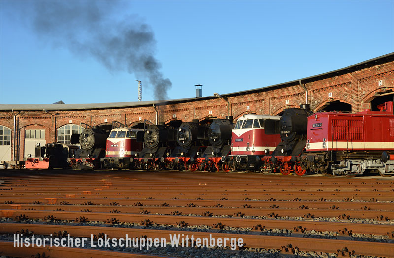 Am 10. Oktober 2015 sonnen sich die Lokomotiven des Historischen Lokschuppen Wittenberge im schönsten Herbstlicht.