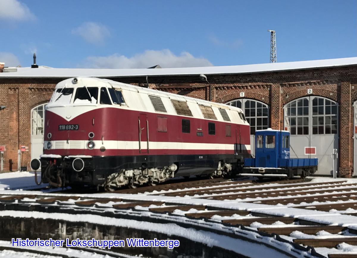 118 692-3 und der SKL haben sich im Winterkleid vor unserem Lokschuppen so ablichten lassen.