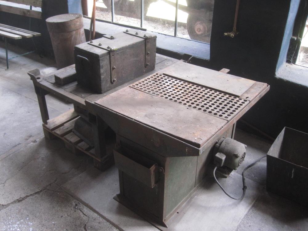 Im hinteren Teil des Lokschuppens wurden inzwischen zwei typische Arbeitsplätze von Lokschlossern aufgebaut. Einerseits handelt es sich um einen sogenannten Schweißtisch, auf dem Metallteile geschweißt wurden. Die beim Schweißen entstehenden gesundheitsgefährdenden Dämpfe wurden mittels eines Saugzuggebläses durch die Lochplatten auf der Oberseite des Tisches abgesogen und nach außerhalb des Gebäudes geleitet.