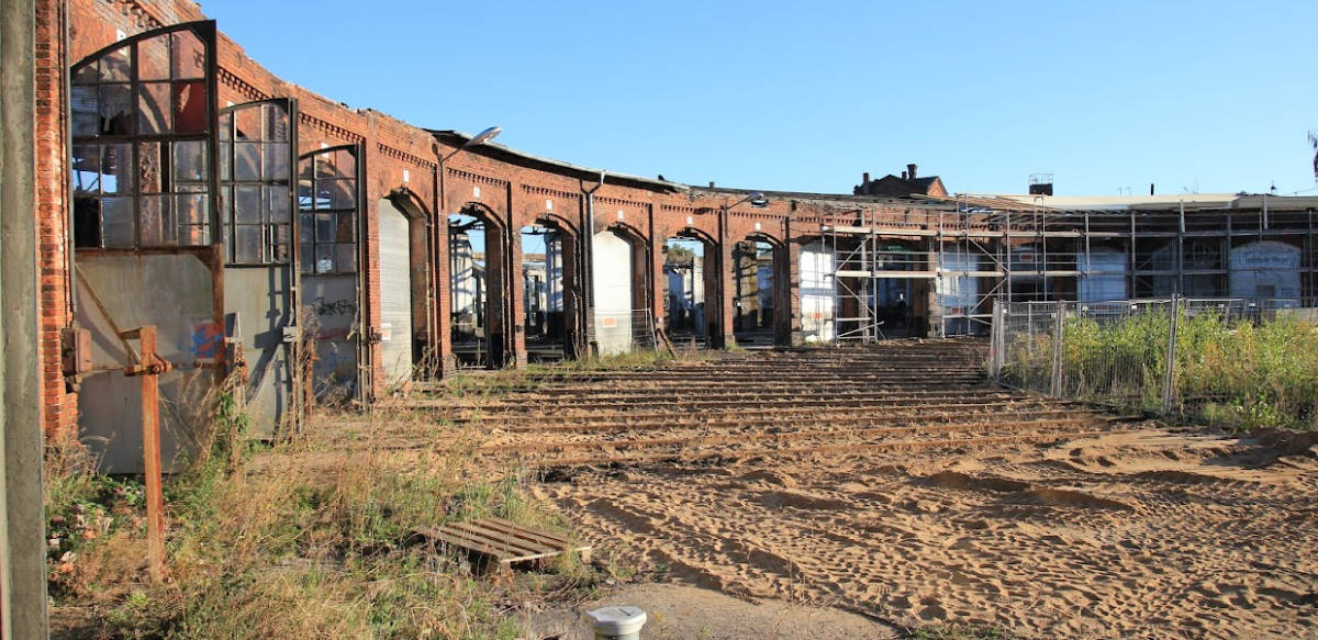 Ein Blick entlang der Vorderseite des Lokschuppens. Wo zunächst Bäume und Unkraut wuchsen, liegen heute wieder die Gleise des Museums.