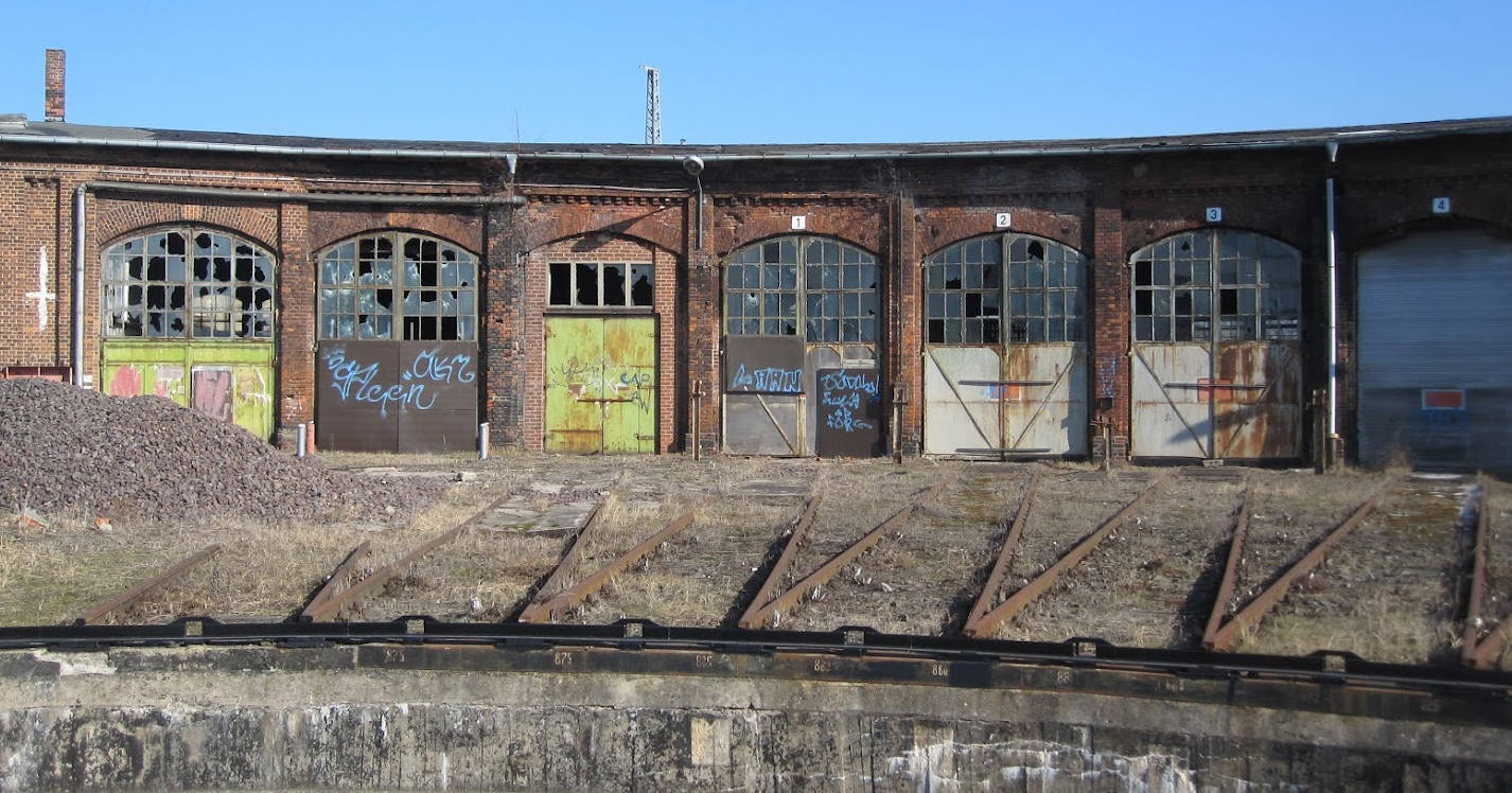 Ähnliches Bild wie oben. Vor 10 Jahren waren noch die Versorgungsleitungen für die ölgefeuerten Dampflokomotiven des Bahnbetriebswerks Wittenberge zu erkennen. In ihnen wurden Schweröl statt Steinkohle zum Erhitzen des Wassers im Kessel verbrannt.