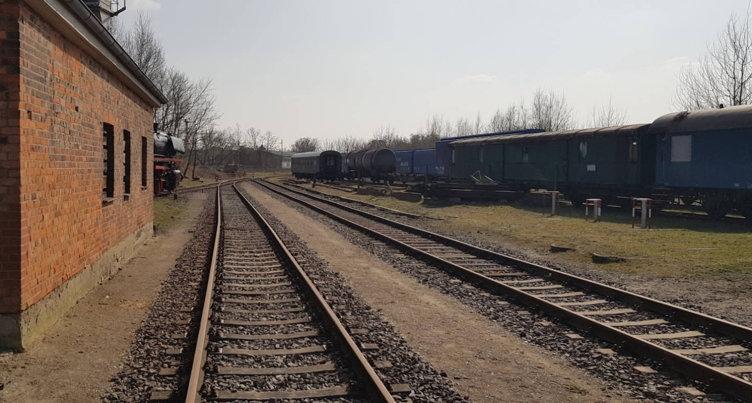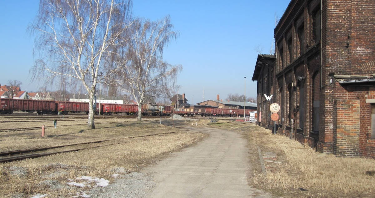 Blick auf die ehemalige Magdeburger Bahnhofsseite. Hier fuhren bis 1999 die Züge in und aus Richtung Süden. Heute finden hier unsere Führerstandsmitfahrten statt. Außerdem ist ein Gleisbaumaschine ausgestellt. Die Brachfläche daneben wird seit kurzem durch eine Straße und ein kleines Einkaufszentrum belebt.