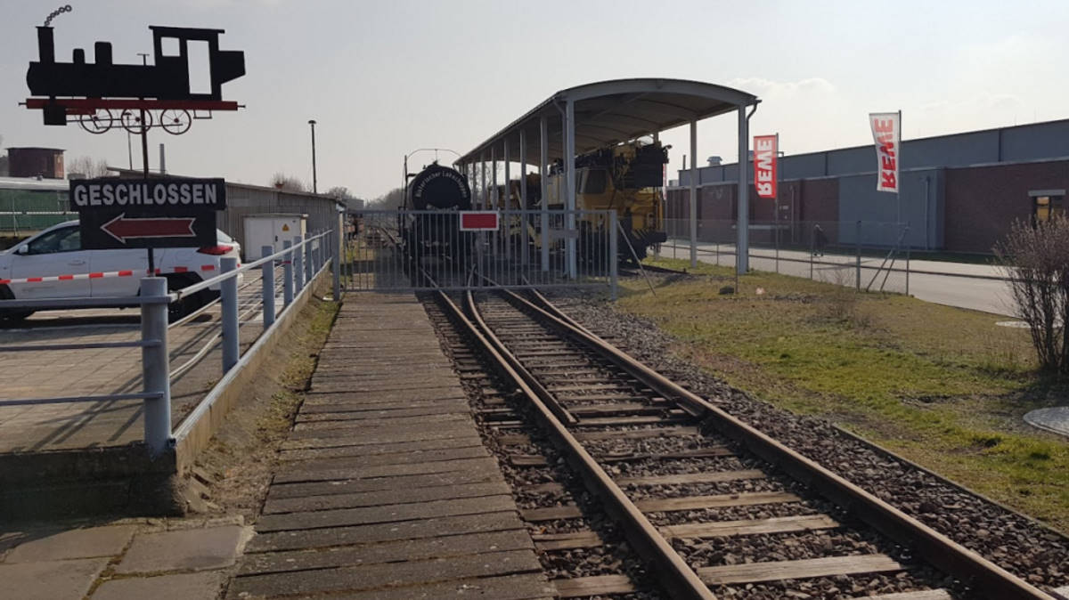 Blick zurück auf den Lokschuppen 2, der heute das Museum beherbergt. Rechts im Bild das ehemalige Wasserhaus, in dem sich ehemals große Wasserbehälter zur Versorgung der Dampflokomotiven befanden