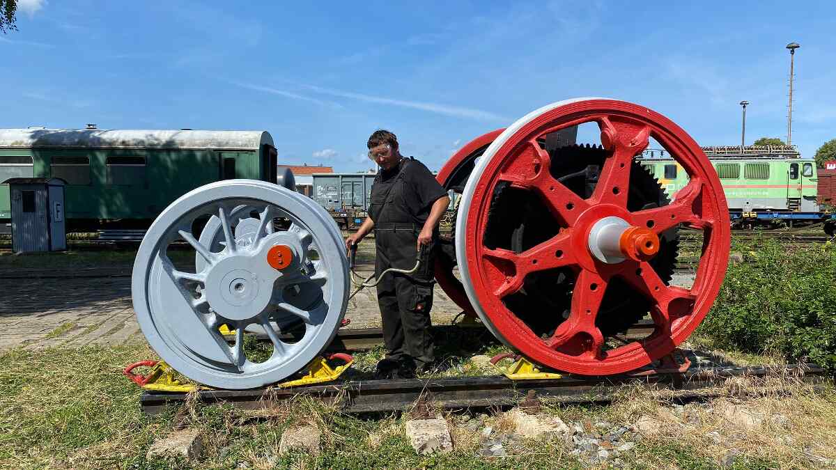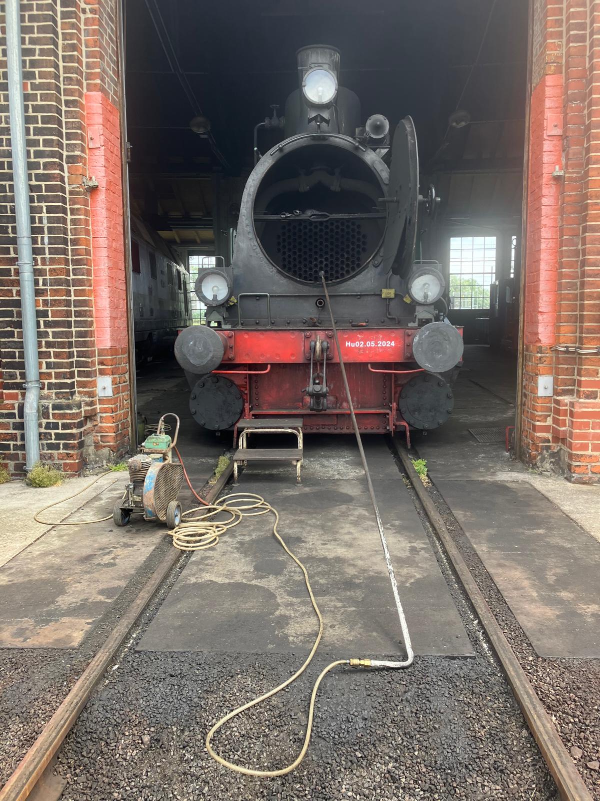 An diesem Wochenende haben wir Emma schon auf ihren nächsten Einsatz vorbereitet und alle Betriebsstoffe ergänzt. Außerdem haben mittels Druckluft die Kesselrohre von Staub und Ruß befreit, durch die die heiße Luft von der Feuerkiste in Richtung Rauchkammer strömt. Da lagern sich bei jedem Einsatz immer wieder Verbrennungsrückstände ab und behindern die Wärmeübertragung in den Kessel. Nach ihrer Behandlung macht sie bestimmt wieder viel Dampf.