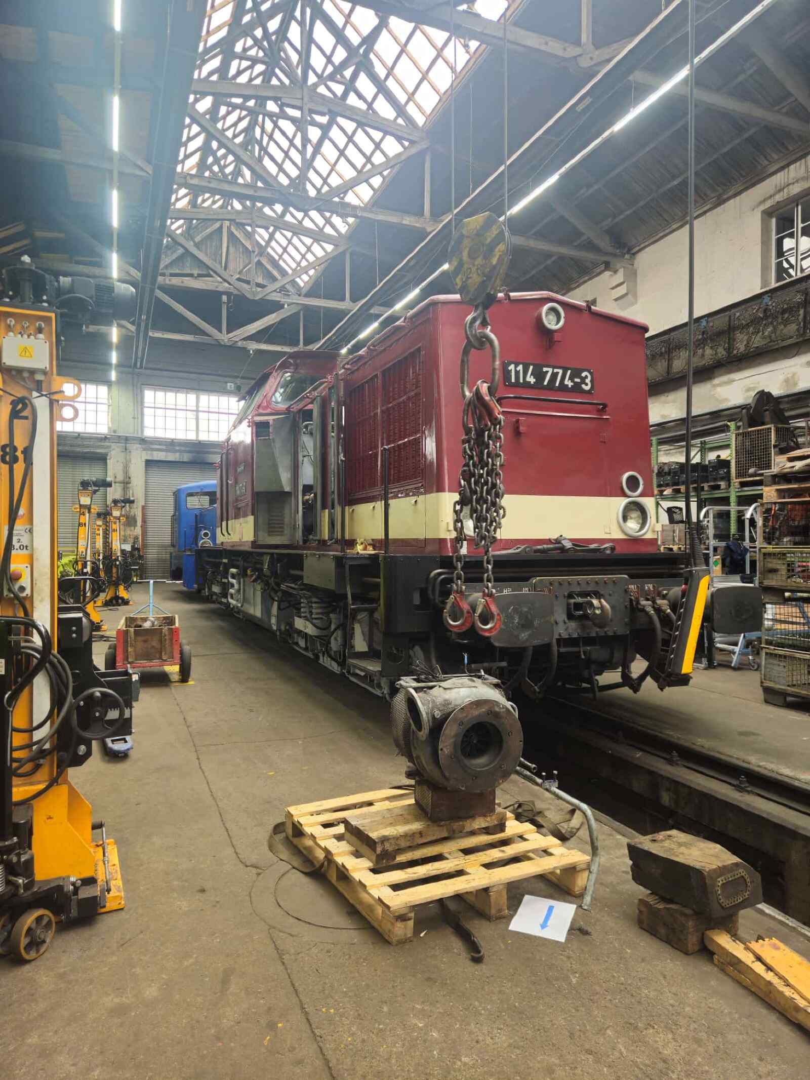 schon wieder ist ein Jahr vergangen und wir steuern auf Weihnachten und den Jahreswechsel zu. Natürlich denkt man dabei auch an Geschenke. Das tun wir auch. So freuen wir uns besonders über unser größtes Weihnachtsgeschenk dieses Jahr. Unsere Diesellok 118 748 ist nun wieder betriebsfähig. Ein paar Worte zu der Lok: Sie wurde 1968 bei beim VEB Lokomotivbau Karl Marx in Potsdam-Babelsberg gebaut, verfügt über zwei Dieselmotoren mit je 1.200 PS und darf maximal 120 km/h schnell fahren. Damit ist sie eine Universallok, die sowohl im Personen- als auch im Güterverkehr eingesetzt wurde. Nach ihrer Abstellung durch die Deutsche Bahn AG im Jahr 1999 wurde sie an die Mitteldeutsche Eisenbahn verkauft, die sie in 2020 an die Firma PRESS weitergab. Seitdem bereichert sie unsere Fahrzeugsammlung, bisher allerdings nur als funktionsfähiges Ausstellungsobjekt ohne Streckenzulassung. Im Jahr 2023 erwarb ein Mitglied unseres Vereins die Lok.