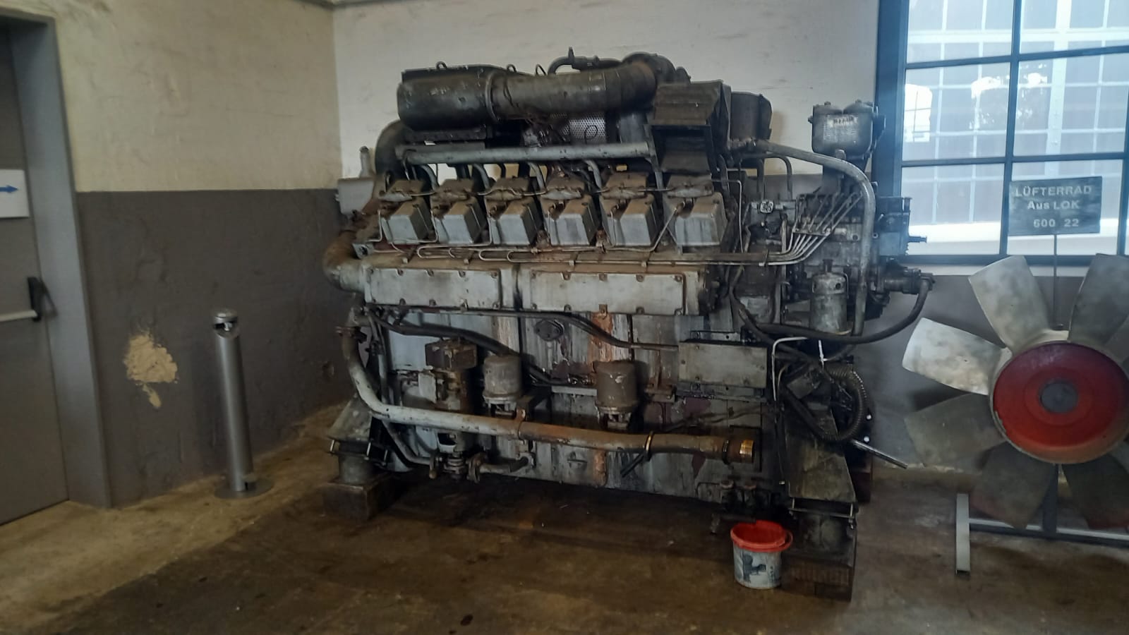 So ein Motor ist übrigens etliche Tonnen schwer und nicht so einfach zu bewegen, wenn man nicht über das notwendige Equipment verfügt. Zum Glück steht uns dafür nun ein großer Gabelstapler aus DDR-Produktion zur Verfügung, der früher im nahegelegenen Nähmaschinenwerk eingesetzt wurde. Für die Technikbegeisterten: Es handelt sich um einen Takraf DFG6302/HG aus dem Jahr 1977. Er wurde vom VEB Verlade- und Transportanlagen Leipzig "Paul Fröhlich" gebaut und wird von einem Dieselmotor angetrieben, wie man ihn auch aus DDR-LKWs der Bauart W50 kennt.