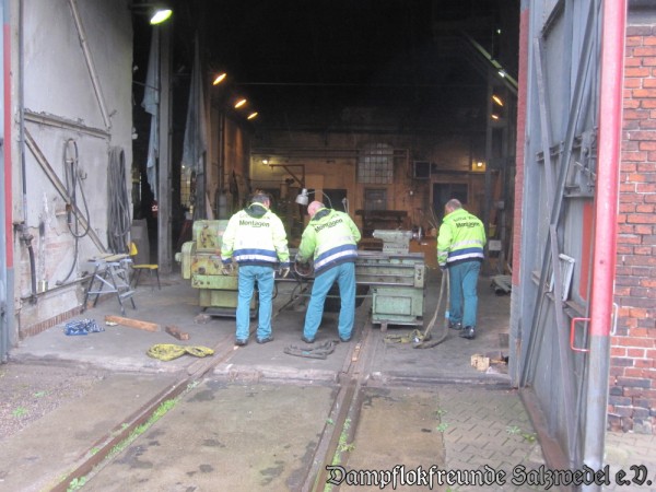 Am Samstag, den 6.10. startete die heiße Phase des Umzuges von Salzwedel nach Wittenberge. Schwerpunkt war erstens der Umzug unserer Werkzeugmaschinen (Drehbank, Presse, Bohrwerke, Holzbearbeitungsmaschinen usw.) Dabei handelte es sich jeweils um "dicke Brocken" mit Gewichten zwischen 300 Kilogramm bis fast 4 Tonnen Gewicht. Wir waren sehr froh über die Unterstützung von Profis, die mit ihrem schweren Gerät die Anlagen scheinbar mühelos bewegen und in Wittenberge aufbauten.
