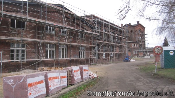 Inzwischen haben die Bauarbeiten im Bereich der Lokschuppen II und III des ehemaligen Bw Wittenberge begonnen: