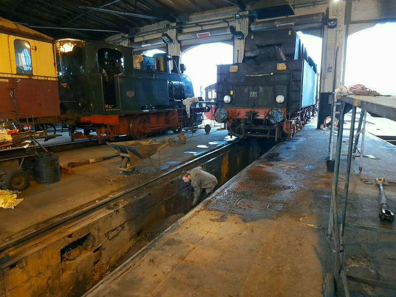Die kleinen Dampfloks wurden auf die Untersuchungsgrube unter freiem Himmel gestellt und ausgeschlackt. Anschließend wurden die Kessel entwässert, um Frostschäden im Winter zu vermeiden.