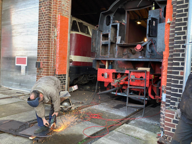 Weiter ging es auch am zukünftigen Tender der Lok. Nachdem bestimmte Bereiche vor zwei Wochen gesandstrahlt wurden, konnten nun noch einige Blecharbeiten durchgeführt werden. Verrostete Bleche wurden herausgeschnitten und durch neue ersetzt.