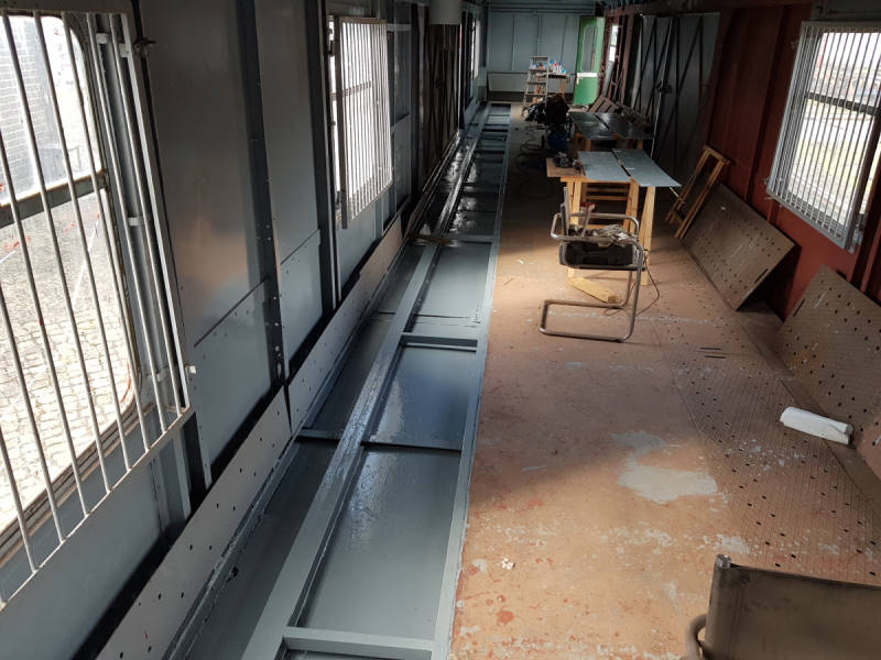 Auch der Autotransportwagen aus dem Regierungszug von Walter Ulbricht braucht ein wenig Zuwendung. So wurden die Fahrspuren im Inneren des Wagen gereinigt und neu lackiert, damit der Rost keine Chance hat.