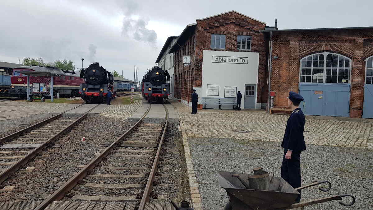 Am Freitag wurden die Fahrzeuge aus dem Museumsbestand sowie zwei Gastlokomotiven in eine fotogerechte Position gebracht. Wir danken der Firma WFL, dass wir die Ellok 112 024 und die Diesellok 231 012 ausstellen durften. Bei der erstgenannten handelt es sich um eine Elektrolok der letzten DDR-Generation, die für eine Höchstgeschwindigkeit von 160 km/h ausgelegt ist. Sie und ihre Schwestern befördern auch heute noch Personenzüge auf dem Netz der Deutschen Bahn AG.