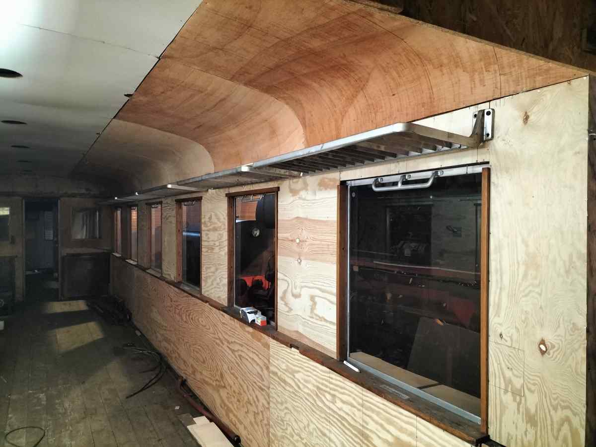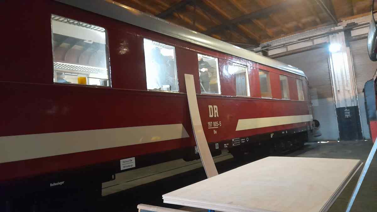 Mit deutlich sichtbaren Schritten ging der Innenausbau unseres Wagen 190 805 voran. Hier konnte die neue Deckenverkleidung aus Sperrholz angebracht werden.