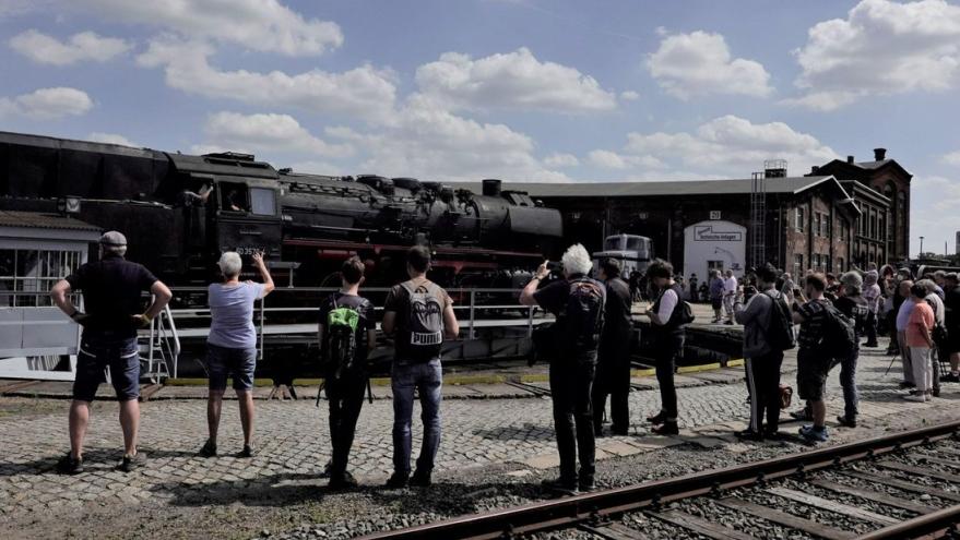 Ganz harte Fans beziehen mit Kameras an den Gleisen Position, um die in Rauchschwaden gehüllte 50 3570 4 während der kurzen Fahrten abzulichten. Staunend verfolgen die Zuschauer, wie die riesige Dampflokomotive auf der dagegen klein wirkenden Drehscheibe vor der Halle mehrere Kreise beschreibt.